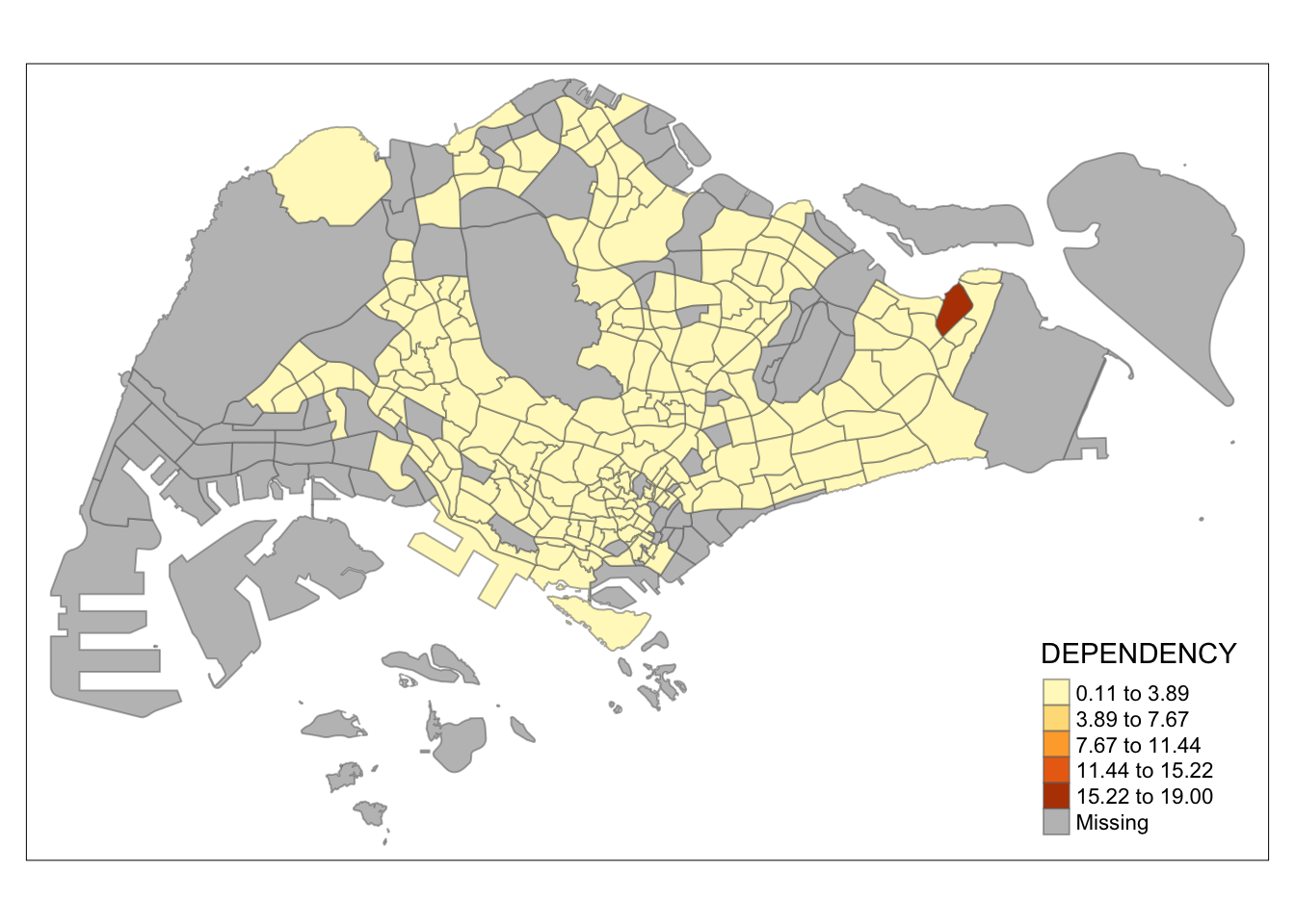 Before we get started, it is always a good practice to get some descriptive statistics on the variable before setting the break points. Code chunk below will be used to compute and display the descriptive statistics of DEPENDENCY field.