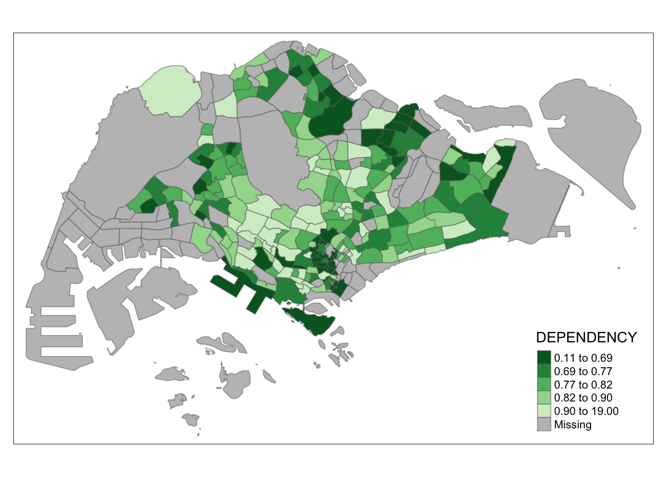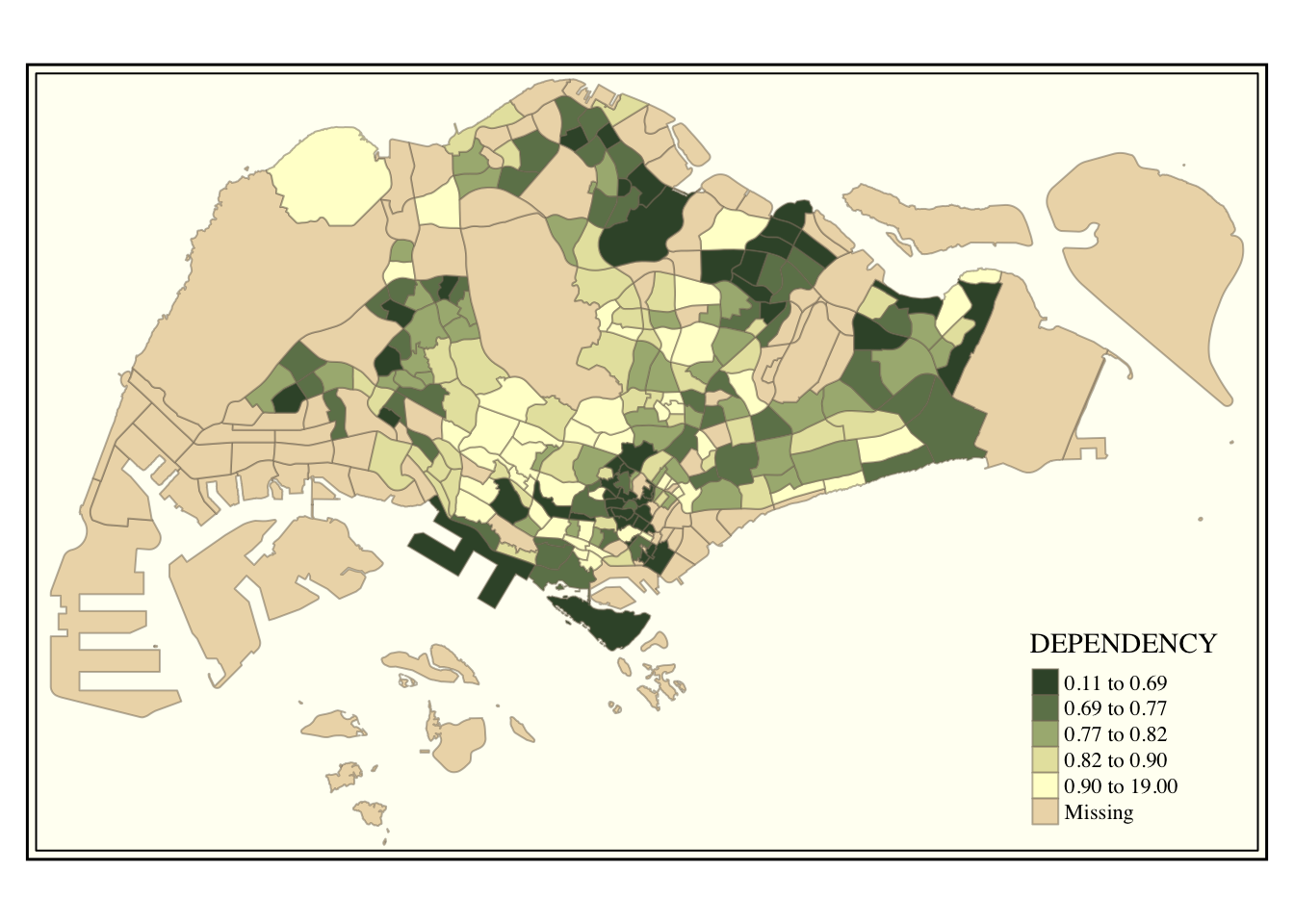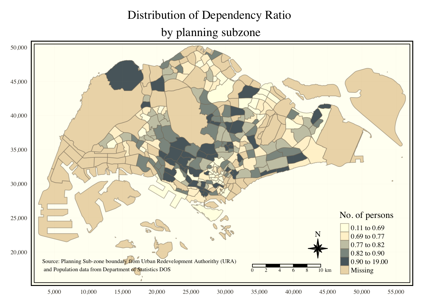 tm_layout(main.title = "Distribution of Dependency Ratio \nby planning subzone",
