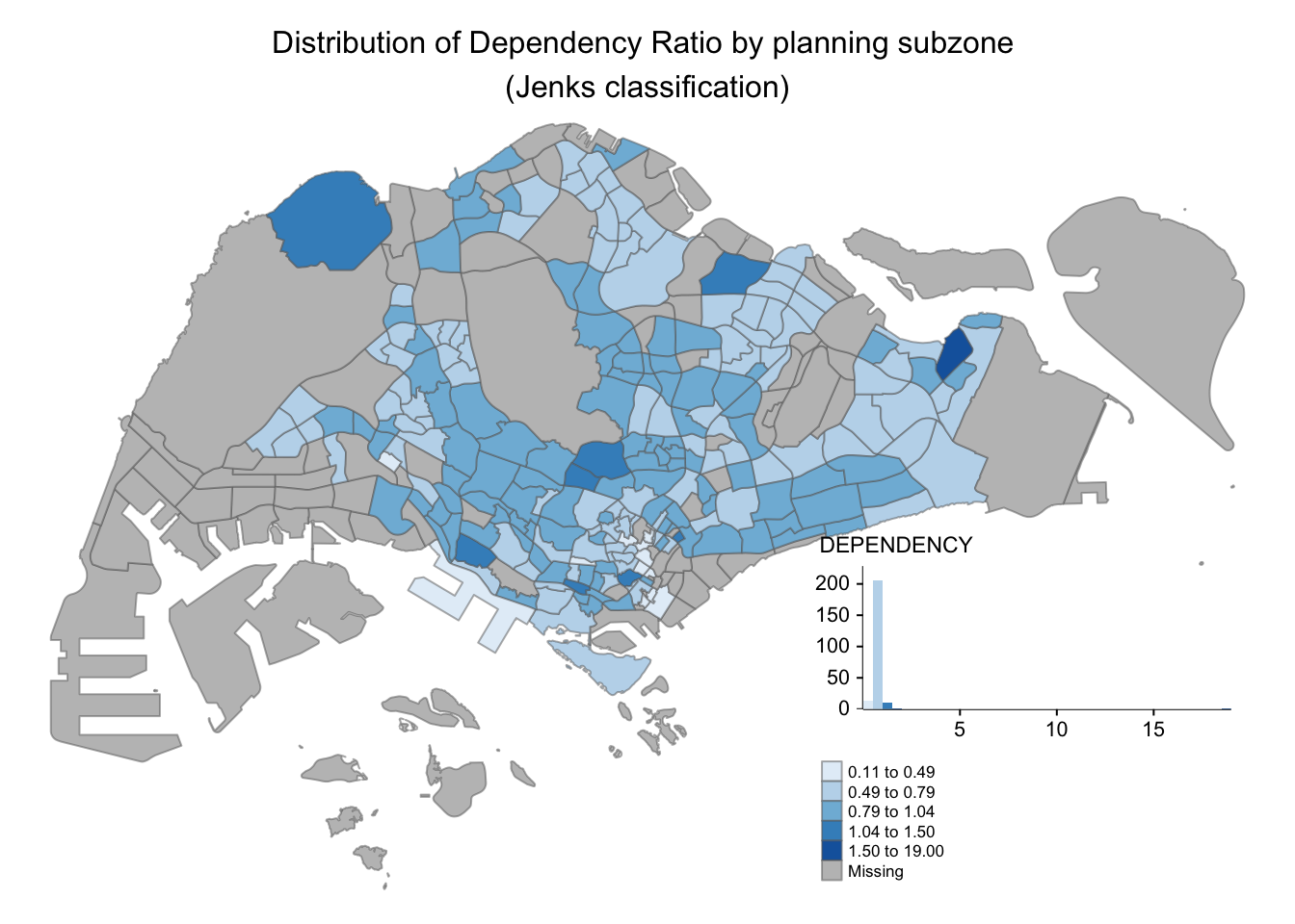 tm_layout(main.title = "Distribution of Dependency Ratio by planning subzone \n(Jenks classification)",